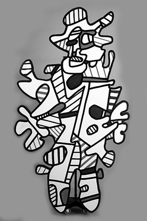 Jean Dubuffet’s best-known works emerged during the cycle entitled L’Hourloupe (hourloupe containing allusions to roaring, hooting and a wolf); the theatrical piece Coucou Bazar (1972–1973) was the climax of that series. L’Hourloupe works originated in loose scribbles that Dubuffet enlarged into graphic forms; Coucou Bazar was performed by actors in costume alongside mobile cut-outsculptures, called ‘practicables’, borrowing the theatrical term for moving elements of scenery.